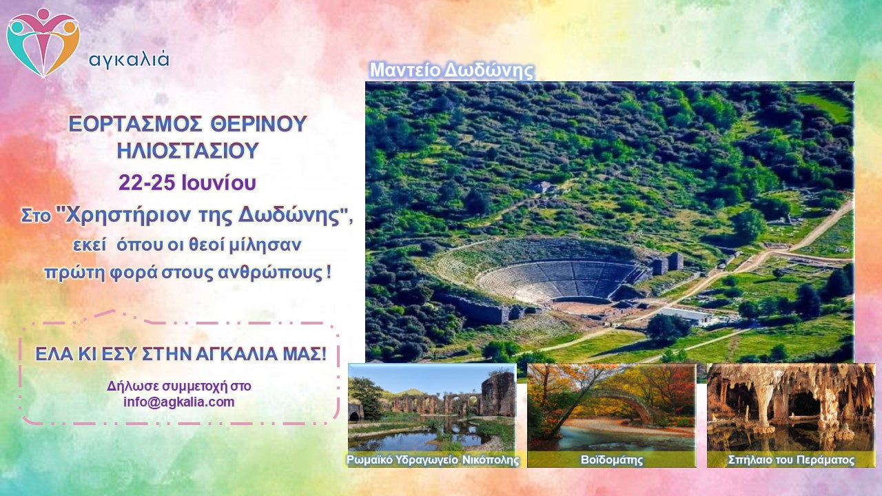 Η Ομάδα της «Αγκαλιάς» ετοίμασε για σένα πέντε μέρες, τέσσερις νύχτες – ένα ταξίδεμα, να ξεκινήσεις το καλοκαίρι σου στη Δροσιά της Αρμονίας – της Ειρήνης – της Αγάπης ! Ένα ταξίδεμα της έλξης για την Ένωση των αντιθέτων πόλων και την διατήρηση της Αιωνιότητας σε όλες τις μορφές της ζωής και της φύσης.